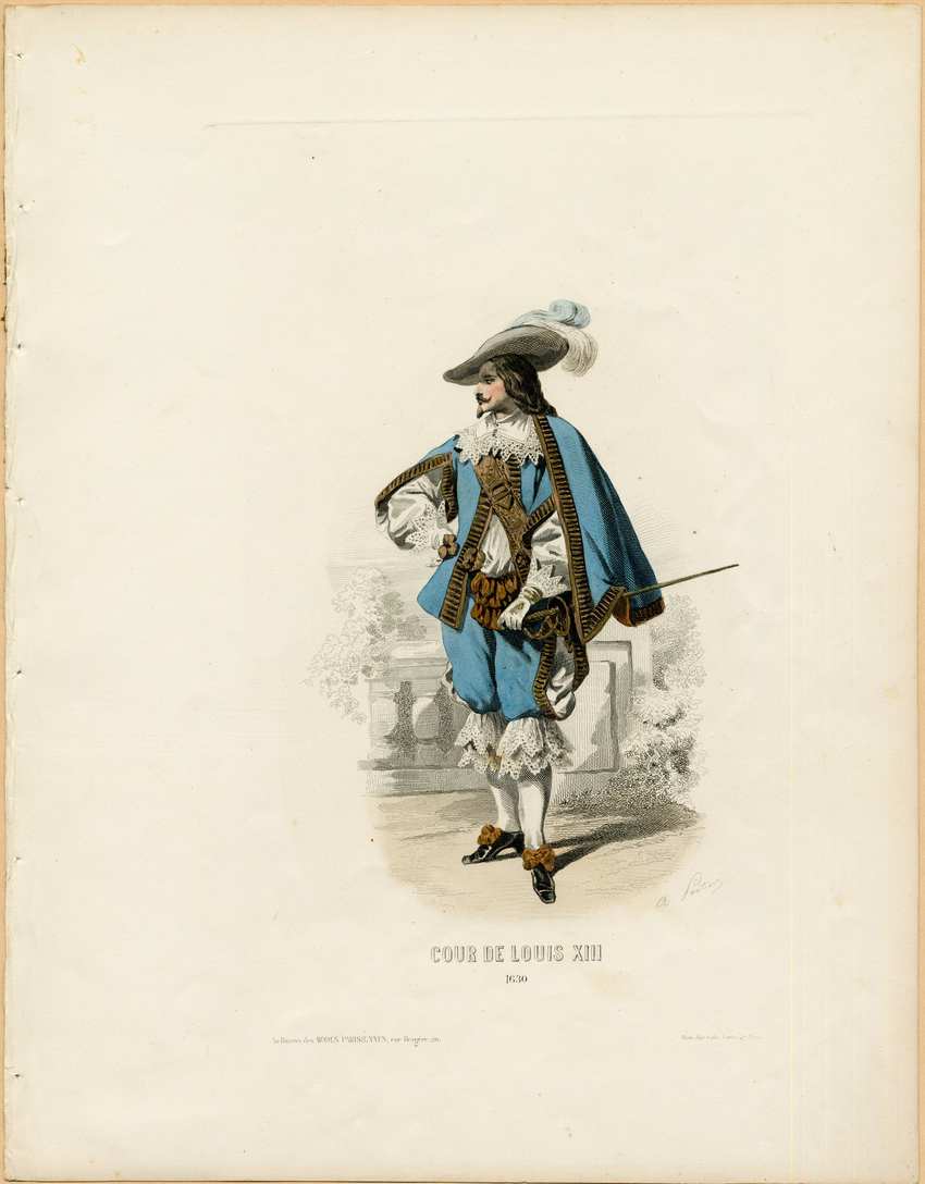 A gentleman wears the costume of the court of Louis XIII. He wears a pointed-brimmed, gray hat with blue and white feathers. He wears a wide white collar, edged with point edged lace that covers part of his shoulders. His coat and breeches are cornflower blue with gold trim edging the sleeve openings, the front jacket opening, and the sides of the breeches. He wears a cape over one shoulder, also blue with gold trimming the front and hem. Under his coat he wears a white shirt with full sleeves gathered into lace cuffs that match the collar. He wears a wide gold strap over his shoulder, from which he hangs his sword. The breeches are trimmed at the knee with a double ruffle of white lace. He wears white stockings and high heeled black shoes with gold rosettes on them. He stands in front of a low white balustrade, with trees visible behind.