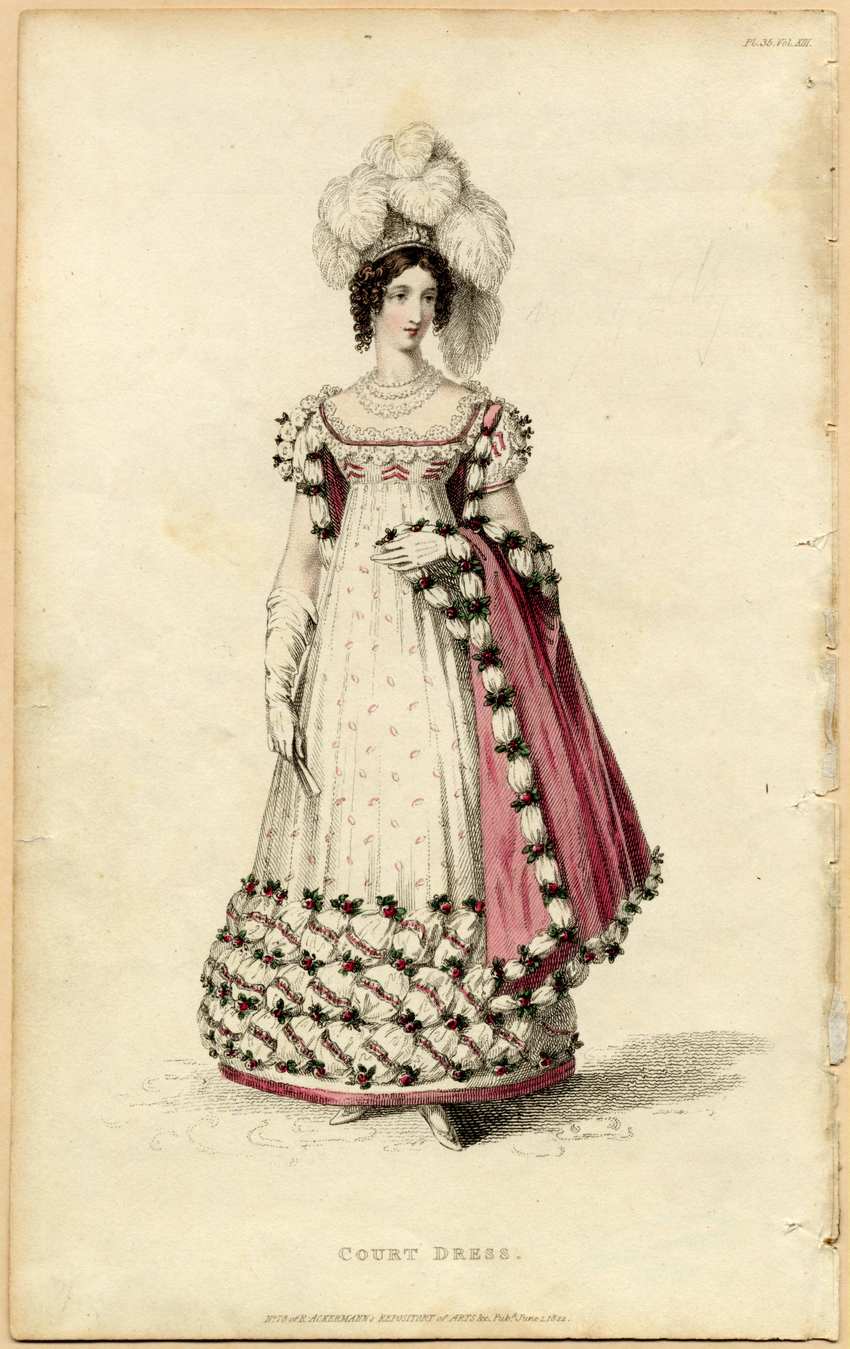 A woman wears a white court dress with an empire waist and short, puffed sleeves. The low, square neck is edged in pink ribbon and two rows of white lace. Three columns of pink chevrons decorate the bodice. White flowers, lace, green leaves, and pink chevrons adorn the sleeves, which are trimmed in pink. The skirt is sprigged with pink and has a wide border of puffed, ruched white fabric striped with pink and interspersed with pink rosettes. A pink train falls from the shoulders.