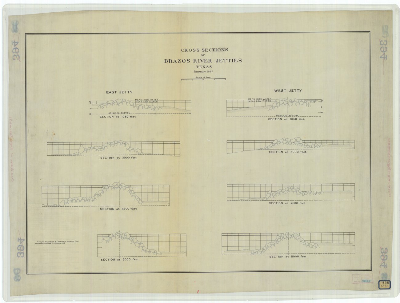 The Cross Sections of the Brazos River Jetties are technical drawings that show the structure and engineering design of the jetties built at the mouth of the Brazos River in Texas. These jetties were constructed to control the flow of the river and improve navigation by preventing sediment from blocking the channel. The cross-section views reveal how layers of stone, wood, and other materials were used to strengthen the barriers against water pressure and erosion. Such drawings are essential for understanding how civil engineers planned and maintained coastal and river infrastructure in the late 19th and early 20th centuries.