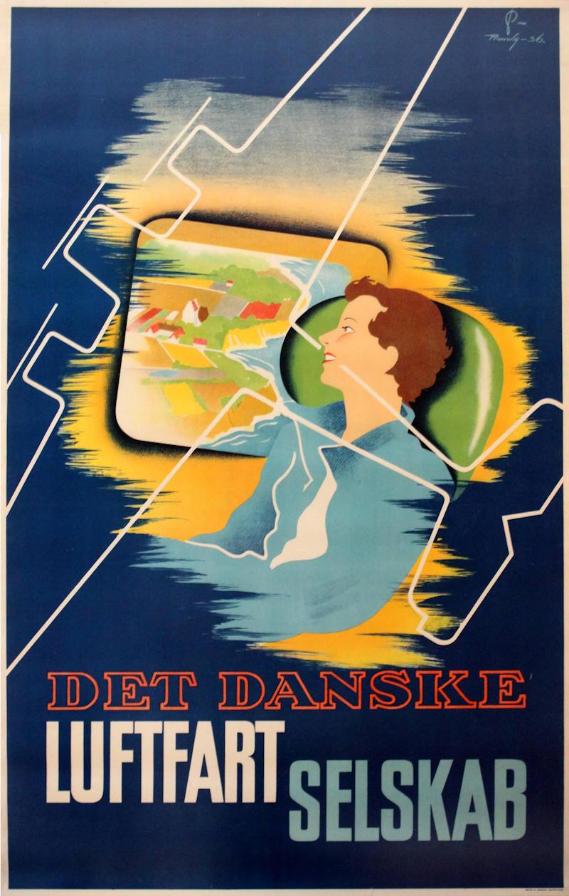 Vintage advertising poster for the Danish airline Det Danske Luftfartsselskab (DDL). DDL was founded in 1918 and was one of the world’s first airlines. The poster depicts a passenger looking out the window of an airplane at the coastal landscape below.