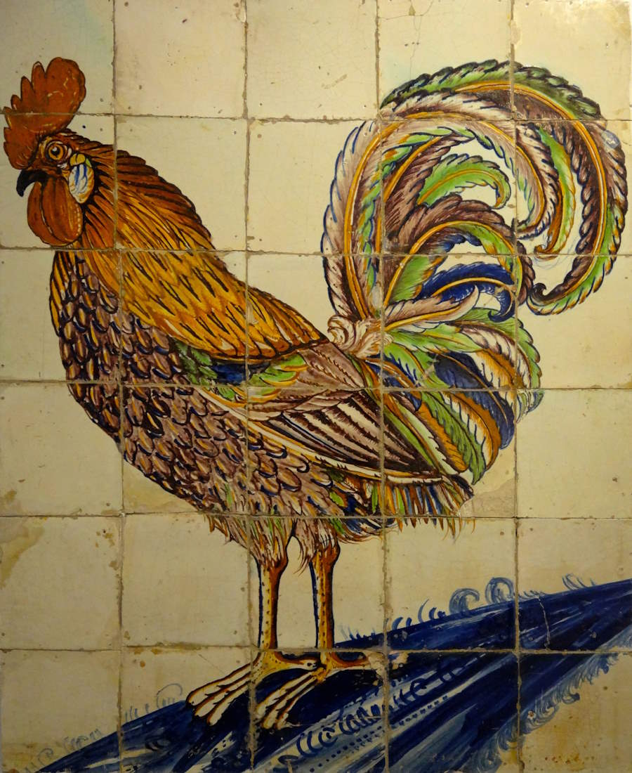Tile tableau from the De Swaen pottery factory in Gouda. Decorative ceramic tile panel, known as an azulejo, featuring a rooster design.