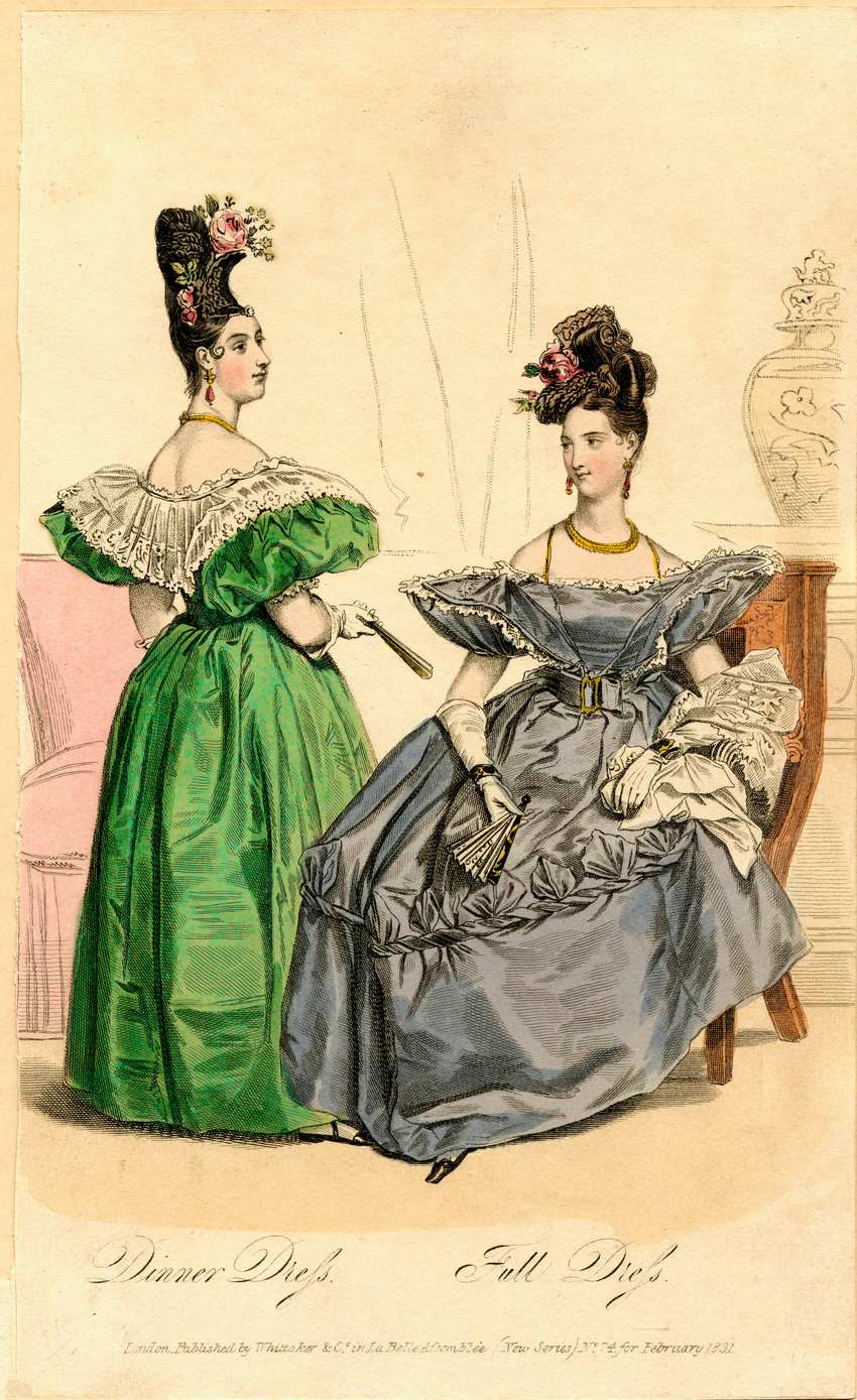One woman wears a dinner dress and the other woman wears full dress for 1831. The woman on the left wears a long green dress with short but voluminous puffed sleeves. The dress has an off-the-shoulders collar of lace covering the tops of the sleeves. She wears black flat shoes, white gloves and carries a fan in her right hand. She wears a gold necklace, gold and pink drop earrings, and a hair ornament that is the same color as her hair. She wears roses in her hair. The woman on the right wears a full lavender dress with short puffed lantern sleeves.