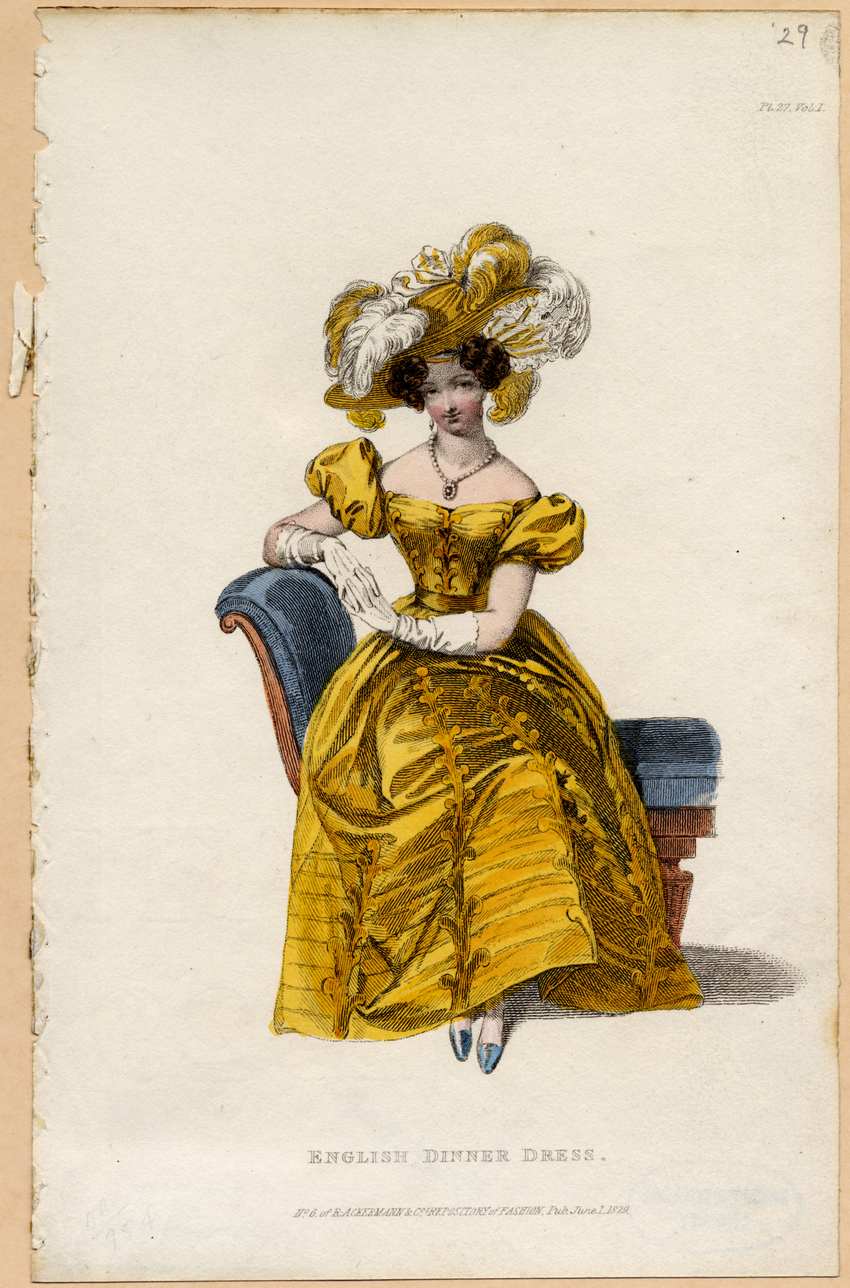 A woman wears a yellow, off-the-shoulder dinner dress with short, puffed sleeves. Vertical lines of decoration run down the front of the dress, and decorative bands adorn the hem. The woman’s shoes are blue, and her elbow-length gloves are white with scalloped edges. She wears dangling, pearl drop earrings and a pearl necklace with a large pendant composed of a purple gem set off by more pearls.
