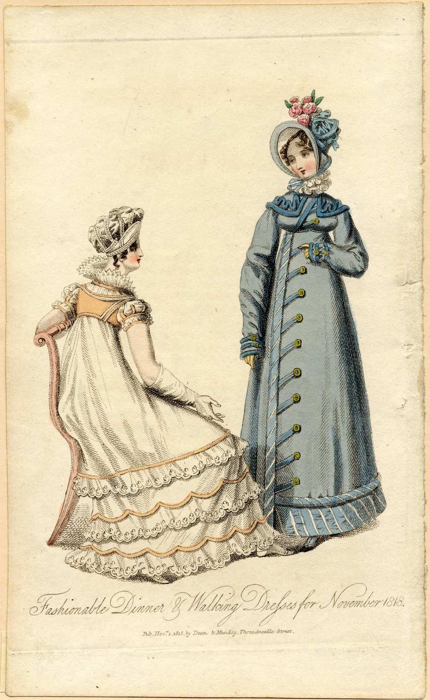 The woman on the left wears a white dinner dress with a peach bodice and trim. It has short, puffed sleeves and an empire waist. The skirt has three ruffled tiers and the collar is a high, lace ruff. She wears white, elbow-length gloves, white shoes, and stockings. Her hair is tucked into an elaborate white bonnet. She sits on a pink and white chair. The woman on the right stands, wearing an empire waist long, blue walking dress. The dress has long sleeves trimmed at the cuffs with three darker blue bands and gold buttons.