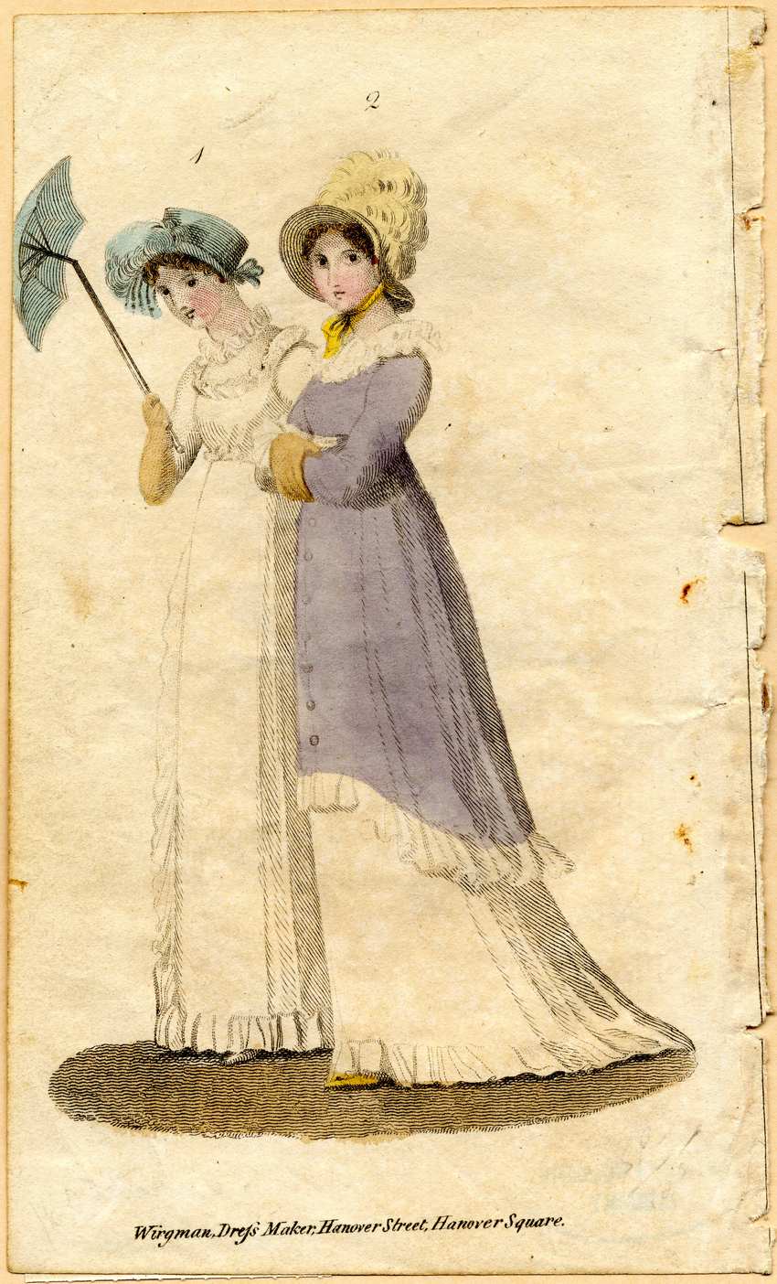 The woman on the left wears a white dress with floor-length skirts, elbow-length sleeves, empire waist, and a high, ruffled neck. Over the dress she wears a long, white pinafore trimmed in ruffles. She wears elbow-length, buff-toned gloves and a pale blue hat with assorted pale blue trimmings around the crown. She holds a long-handled, pale blue parasol in her right hand, and the tip of one white shoe is visible below her skirts. The woman on the right wears a long, white dress with a ruffled hem. Over it she wears a pale purple empire waist pelisse coat with buttons down the front, a white sash, and white ruffles at the neck, cuffs, and curved, knee-length hem. Her hat is pale yellow, covered with feathers, and ties under her chin with a yellow bow. She wears short, buff gloves.