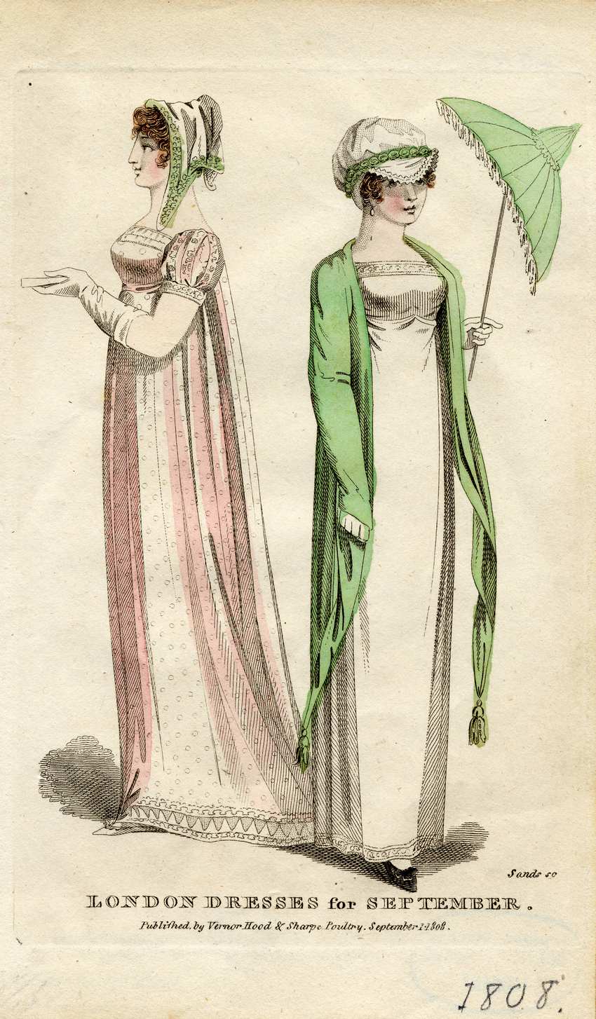 Two women in London dresses for September. The woman on the left wears a white headscarf with light green trim. Her dress is a very pale pink with white dots and trim on the cuffs and vertical decorative bands of the sleeves, the neck, and the hem. The dress has an empire waist and the bodice is very simple with a high, straight neck. The white trim on the dress is detailed with a floral pattern on the cuffs and a triangle pattern at the hem. She wears a pair of white, elbow length gloves and a pair of flat, white shoes.
