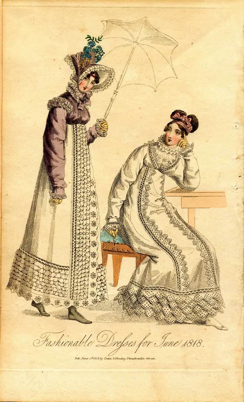 Two women in fashionable dresses for June of 1818. The woman on the left wears a white empire waist ankle length dress with a short lavender Spencer jacket on top. She wears a white ruff around her neck and shoulders. She wears a lavender bonnet with a large brim edged with white ruffles with a lavender ribbon tie and blue flowers. She wears a pink headband around her forehead and yellow gloves and black boots. The skirt is decorated with flower and ruffle borders. She holds an open parasol.