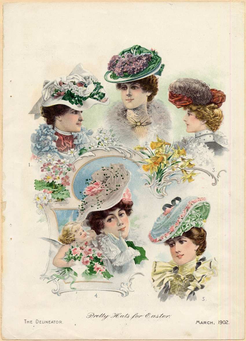 The numbered bust portraits of five women displaying “Pretty Hats for Easter” are arranged in a circle. Hat number one is white with a wide wavy brim, and is decorated with green leaves, pink flowers, bunches of small white flowers, and large white bows. She wears a high collared white blouse with a wide rose pink tie, and a fluffy white boa. Number two is a white medium brimmed hat with green edging, trimmed with bunches of small pink and lavender flowers and green bows, worn tipped forward with a bow at the back.