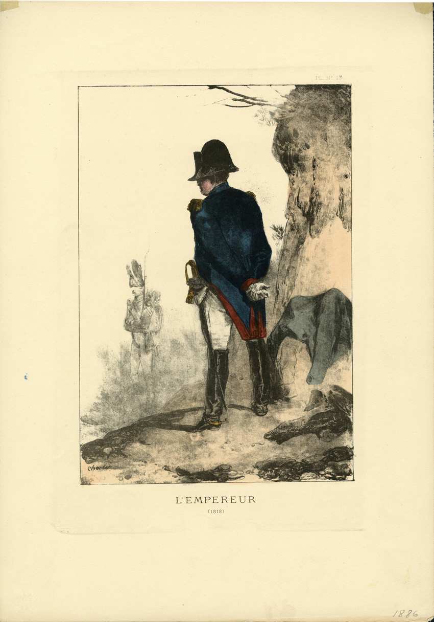 This illustration depicts Napoleon during the period after which he crowned himself Emperor, overseeing one of his military campaigns, with a Grenadier in the background. Napoleon stands facing away from the viewer, with his hands clasped behind his back, wearing his uniform. Tall black boots, white trousers, blue jacket with red facings and cuffs, and gold epaulettes, and the black bicorne hat evoke his position as military commander. He stands in a rocky landscape, and a Grenadier stands in the distance.