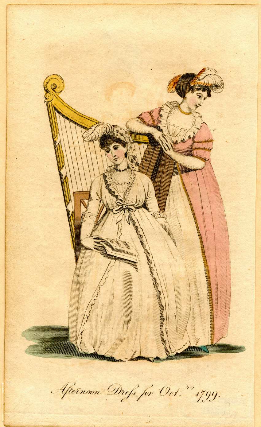 Two women in afternoon dress for October 1799. The woman in front is wearing a white afternoon dress with white gloves. The dress has a plain underdress with a wide ruffle at the neck and a long overdress that has three-quarter length sleeves, and ties together at the waist. A double layer of lace ruffles edge the hems of her sleeves, and the front edge and hem of her overdress.