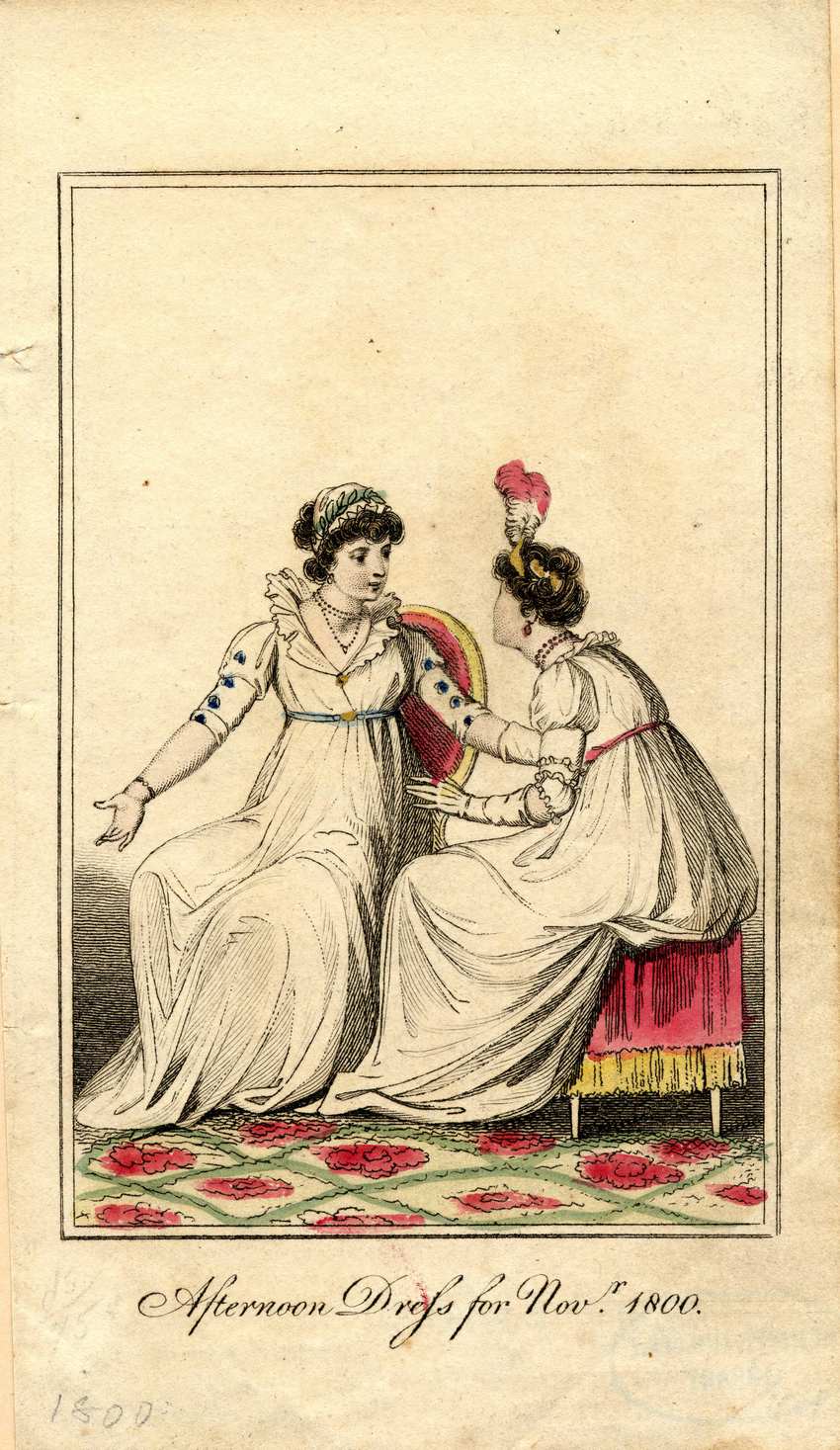 Two seated women in afternoon dress for November 1800. The woman on the left wears a white head wrap or cap with green laurel wreath. She wears a triple stranded gold bead necklace and matching gold earrings. Her dress has a wide white standing ruffled collar on a V-shaped neckline. The top of her dress crosses over and is fastened with two gold buttons, and she wears a narrow light blue ribbon at the waist. Her sleeves are cuffed at the elbow and have four blue knots of ribbon, or buttons, down the sides.