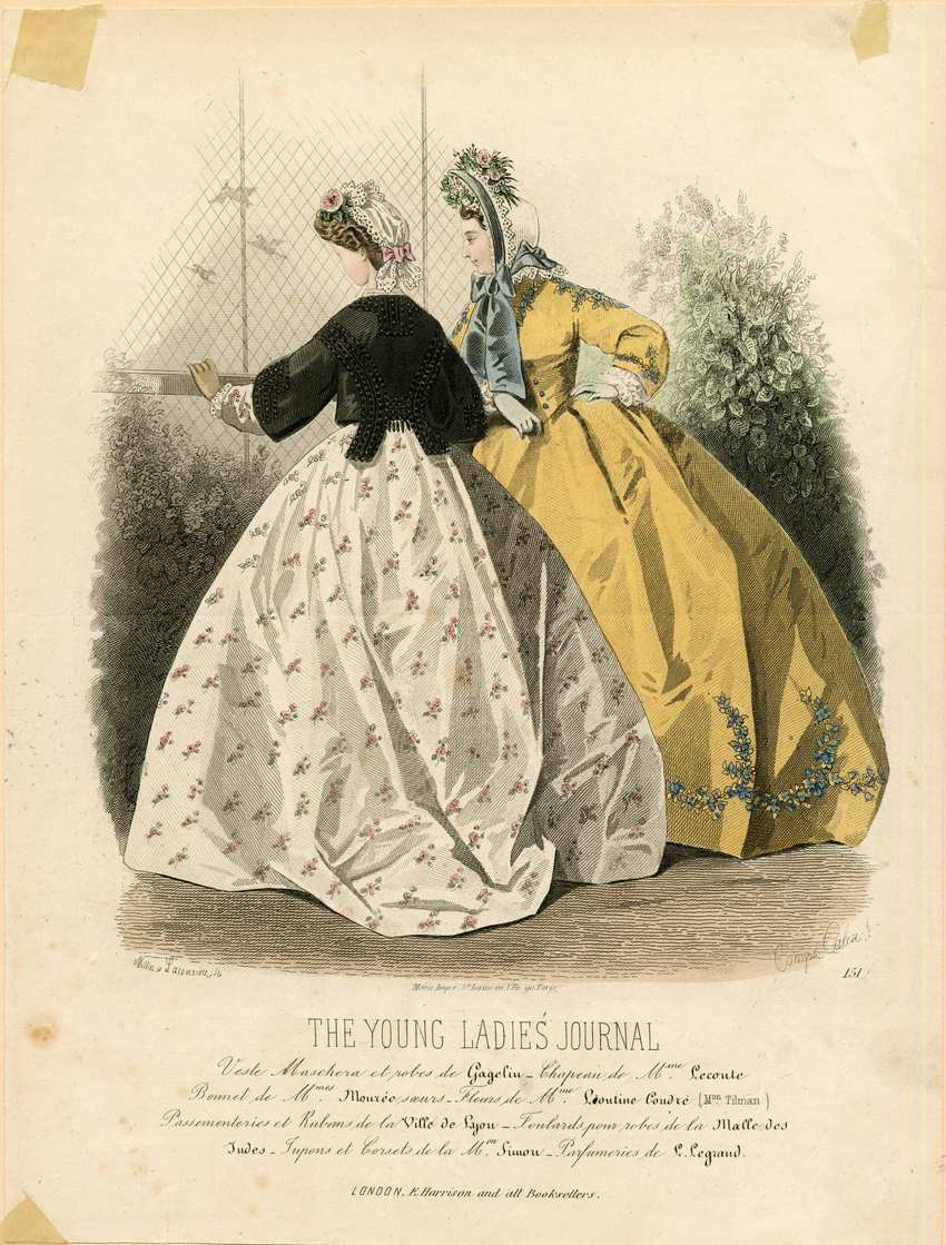 Two women are looking into an aviary, through netting. The woman on the left wears a white lace cap with pink flowers and bows. Her dress is white with a pattern of small pink flowers, and has long sleeves. Over her dress she wears a short black dolman jacket with three-quarter length sleeves. The woman on the left wears a white bonnet with blue ribbon and pink flowers. Her dress is yellow with long sleeves and buttons down her bodice. The dress has blue flowers decorating the shoulders, the ends of her sleeves and at the hem of her skirt. Both skirts are very wide; it is the height of the crinoline fashion.