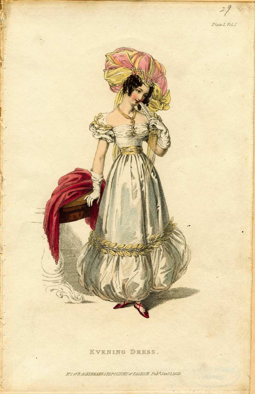 A woman wearing an evening dress from 1829. The dress is white and short-sleeved. The bodice is gathered at the center front with a small yellow ribbon. The waistline is defined by a wide yellow ribbon. The collar is wide and adorned with a garland of yellow leaves, resembling olive branches. Two thirds of the way down her dress the yellow leaf garland is repeated and encircles the skirt.