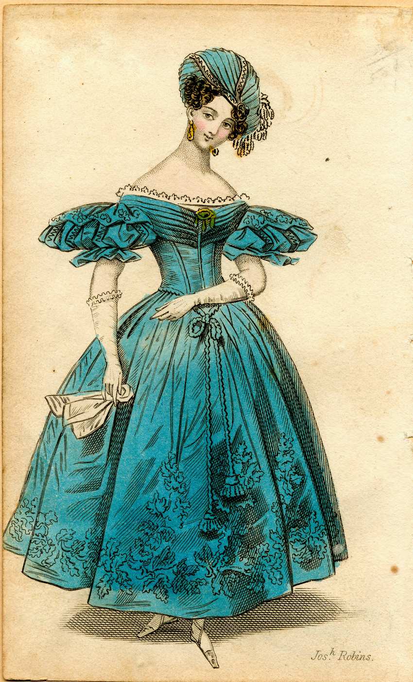 A woman in a dress from 1833. The woman wears a short-sleeved ankle-length blue dress. The off-the-shoulder neck is edged with white lace. The dress has wide puffed sleeves that are decorated with ribbons of the same blue as the dress, and epaulettes of the same fabric as the dress. Her bodice is pleated horizontally at the top, and the bottom is fitted. She wears a gold brooch with three dangling beads at the neck. The bodice is edged with a blue cord that is tied in a small bow, with tassels and the ends. The skirt has a wide pattern of twining leaves along the hem. She wears white slippers, white gloves, gold earrings, and holds a white handkerchief in her right hand. She wears a blue pleated turban with white ribbon detailing and a white feather peeking out from the back of the turban. Her hair is dressed in two bunches of curls. She looks to the left.