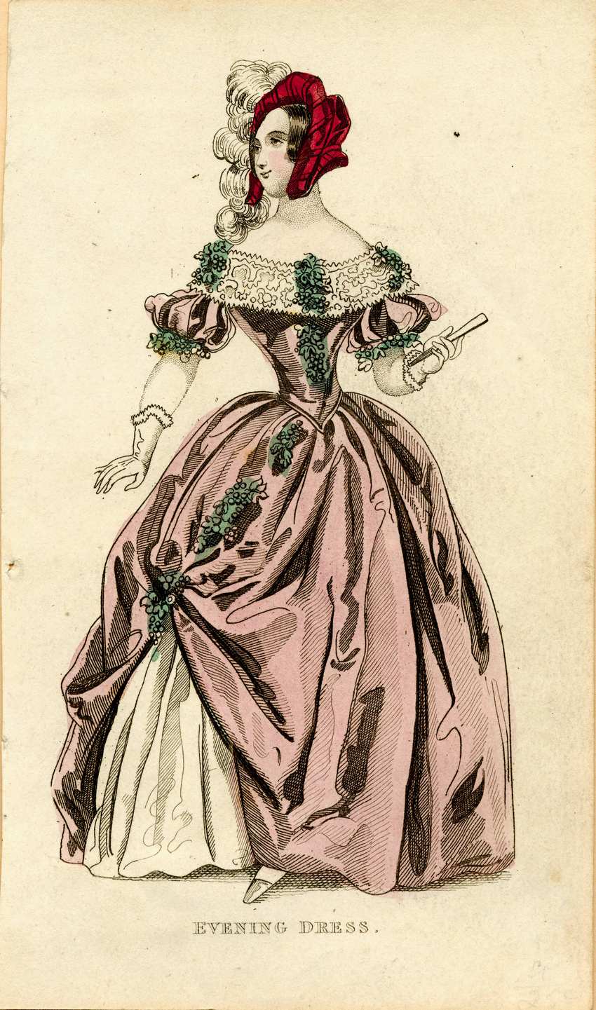 A woman in an evening dress from 1835. The woman wears a pale pink dress with an off-the-shoulder, wide lace collar. The dress has short puffed sleeves and a fitted bodice. There are clusters of green grapes along the collar, the front of the bodice, around the edges of the sleeves, and in a column down the right side of her dress. The skirt is gathered up at the hem, exposing the white underskirt underneath. She wears short, white gloves with narrow ruffles, white shoes, and holds a white fan in her left hand. She wears a red bonnet with short lappets reaching just past her chin, with plumes of white feathers attached to the right side. Her hair is smoothly dressed and swept back.