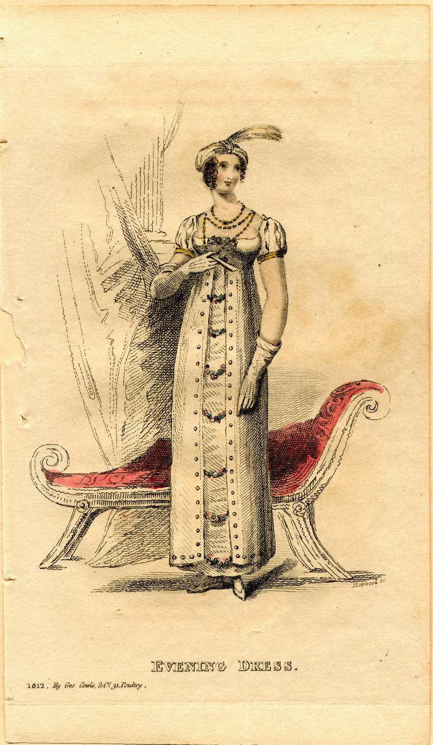 A woman wears an evening dress from 1812. She wears a short-sleeved empire-waisted white dress. The skirt of the overdress is open at the front, letting the underdress show beneath. Pearls line the edge of the overdress skirt. Seven short strands of blue and pink flowers connect the edges of the skirt to the hem and there are flowers on the top of the bodice. Her sleeves are slit vertically to reveal the fabric beneath. The sleeves are edged with gold. She is adorned with a three strand bead necklace and a white turban with a spray of feathers. She wears white gloves, white shoes, and holds a white fan. Behind her is a red upholstered chaise longue, drapery, and a column.