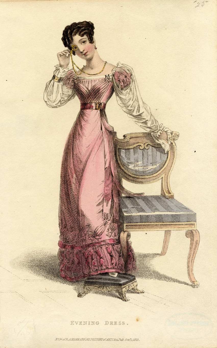 A woman in evening dress for October 1825. She is adorned with gold earrings and a gold monocle which she holds up to her eye. In her other hand she holds a handkerchief. Her sleeves are made of sheer fabric in Leg-of-mutton style over a short, pink, puff sleeve. The bodice of her dress is decorated with diagonal, criss-crossing pleats leading to a flower in each upper corner. The neckline is trimmed with white fabric. The dress is pink and belted at the waist. The belt is pink with a gold buckle and long ends with fringe. The bottom of her skirt is decorated with fabric flowers and vertical bows in ruched fabric. She wears white shoes. She has her left foot placed on a small footstool with elaborately carved legs and black and gray striped upholstery. She leans on a wooden chair with the same upholstery.