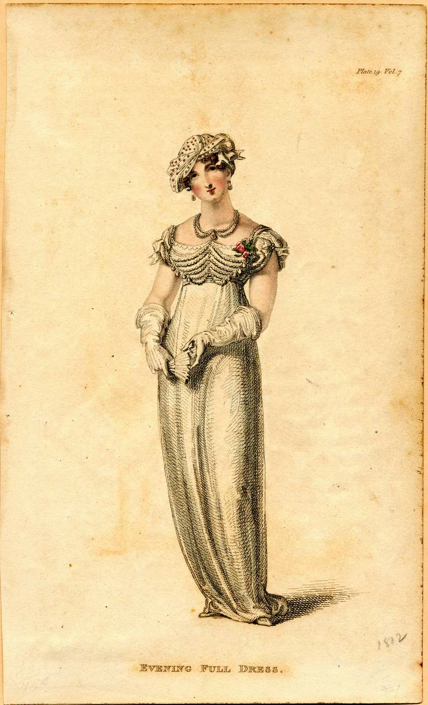 A woman in full evening dress. She wears a long, white, short-sleeved, empire waist dress. The bodice has horizontally draped rows of pearls sewn onto it, which are gathered up at the center. Her skirt is long, white, and plain. She wears long white gloves that are loose on her arms, white shoes, and a white fan. She wears gold earrings and a two-tiered pearl necklace with a gold drop pendant with a red stone in the center. She wears a white bonnet with gold dots, and a ribbon on the left side. The donor has written 1812 in the bottom right hand corner.