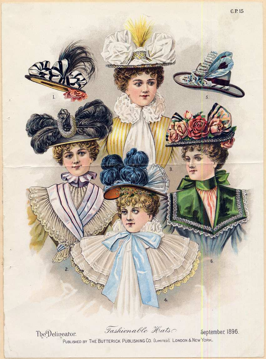 The woman at the center of the bottom row is wearing a wide white frilled collar with a baby blue bow at the neck. Her tan hat has dark blue plumes, light blue sheer ruffles, and pink flowers under the brim. The woman at the bottom right is wearing a pale blue dress with a square green collar with lace trim. Her blouse is pink, she wears a green bow at the neck, and her black hat is trimmed with large pink with roses, and black edged white ribbon.