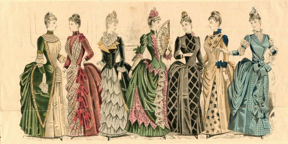 Seven women are depicted. The woman on the far left wears her hair pulled up in a bun, with curly bangs, and pearl earrings. Her dress is green and white with a high collar and long sleeves. The front of her dress is white with ruffles around her collar and waist. The sleeves and back are green with a gold border pattern. Her skirt is draped to the back with pointed overskirt sections at the sides. She holds a white handkerchief in her right hand.