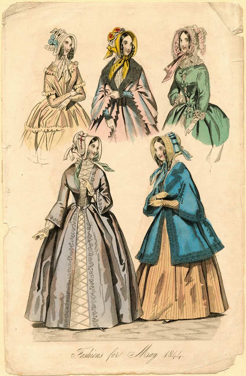 Five women are depicted. The woman on the top left wears a white bonnet with blue flowers, edged in narrow ruffles. Her light yellow dress has long sleeves and ruffles around the bodice, oversleeves, and hips. The top middle woman wears a yellow bonnet with red flowers and white lace. Her white dress is covered with a pink and blue mantelet.