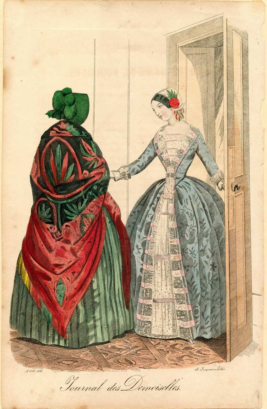 Two women are depicted. The woman on the left faces away from the viewer and wears a green bonnet, a green and black striped dress, and a black, green and red shawl. The shawl has a black background with wide red edging, and has large red and green plant designs. The woman on the right wears a white lace cap with a red flower and green leaves, and red and green trimming at the hem. Her dress is light blue with long narrow sleeves. The fabric is patterned in flowers and sprigs of leaves. Her under-dress is white and pink lace in tiers, with pink ribbons at each tier. The lapels, cuffs, and skirt front are edged with pink and gray stripes, possibly also of lace. She holds open a door for the first woman.