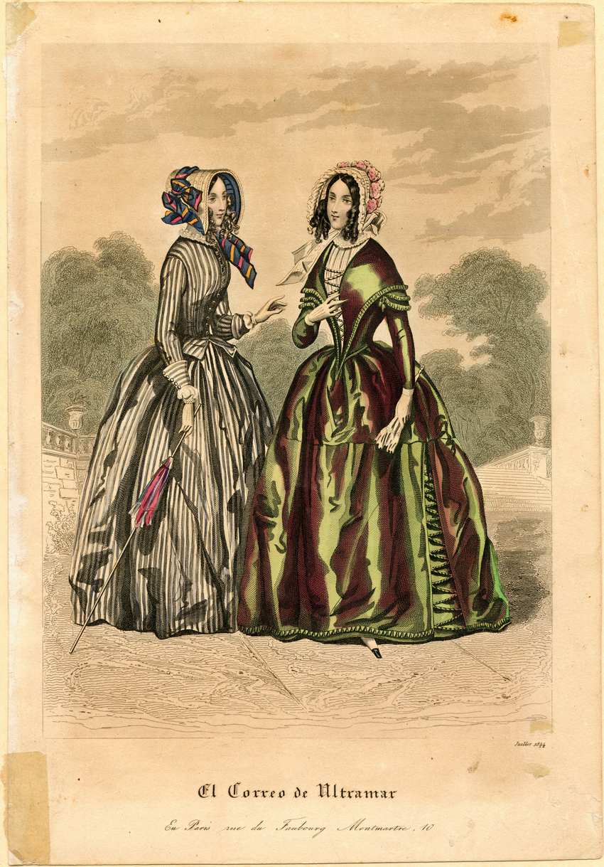 Two women are standing outdoors on a stone terrace with walls decorated with urns, and trees in the background. The woman on the left wears a white bonnet with a blue ribbon with yellow and pink stripes. Her dress is white and gray narrow stripes with a peplum. The bodice is fastened with buttons down the front, and has gauntlet cuffs trimmed with buttons, and a high neckline, edged with a lace collar. She holds a pink and purple parasol in her right hand, and she reaches towards the other woman with her left hand.