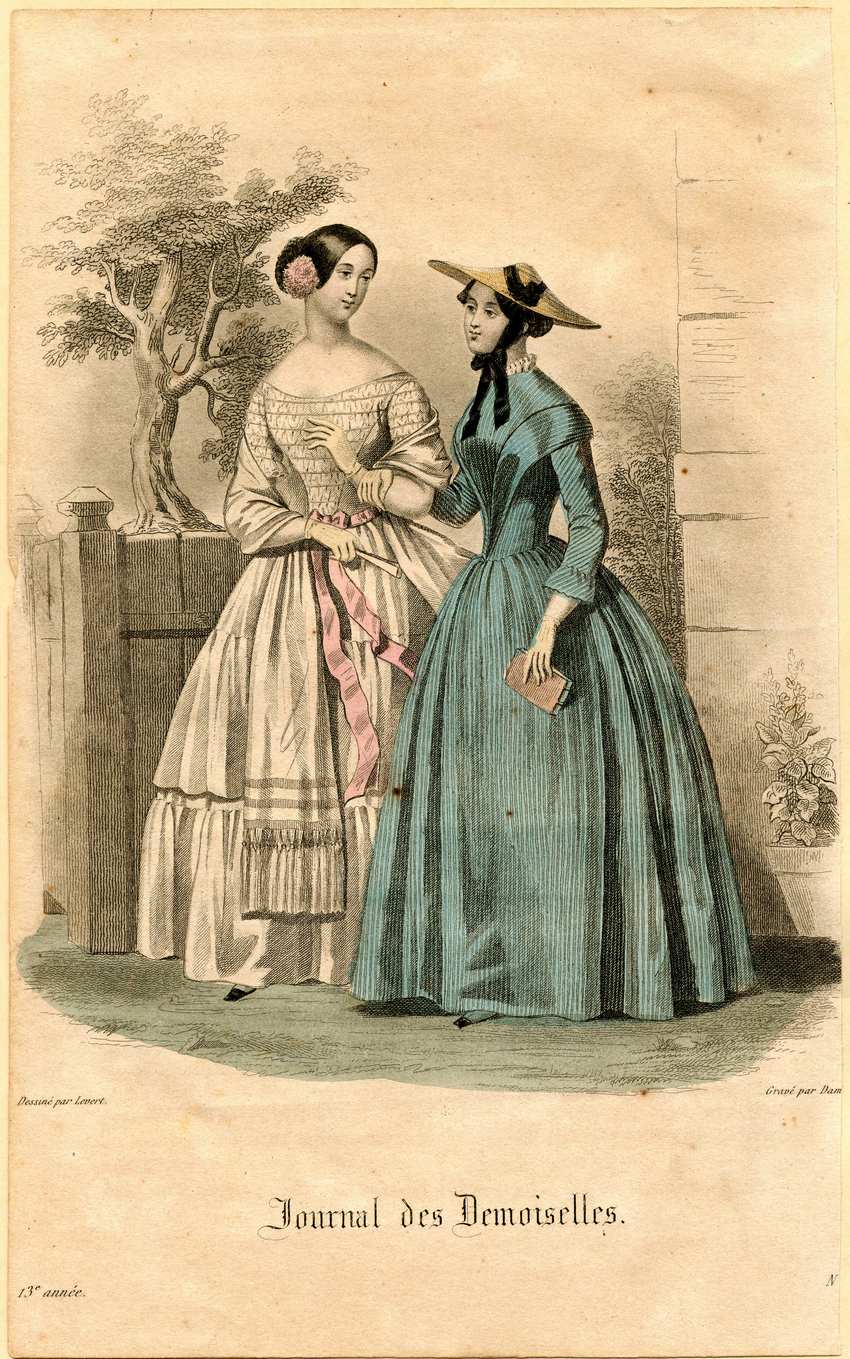 Two women are out of doors. The left one wears her hair in a bun with a pink flower in her hair. Her white dress has a ruched bodice and upper sleeves, and a deep ruffle at the hem. A a pink ribbon is tied around the waist. She wears a white scarf with lavendar strips at the hem that is trimmed with a deep fringe. The woman on the right wears a flat brimmed straw picture hat tied with a black ribbon. Her blue dress has black pinstripes and a high round neck with a white ruffle. Her sleeves are three quarter length and flair out at the hem. She carries a small brown book or box in her left hand, and rests her right hand on the first woman’s arm as they walk in front of a fence. A large tree is visible in the background.