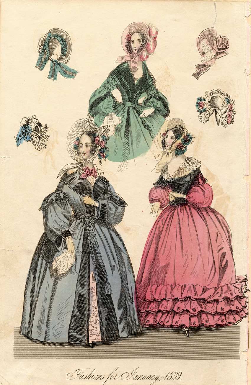 Three women and four single hats for January 1839. The hat in the upper left hand corner is a wide brimmed white bonnet with green ribbon detailing around the crown and lining the inside where the brim meets the crown. The second hat is a small white bonnet with lace trim and a blue bow. The woman in the top center wears a pink wide brimmed bonnet with pink and white feathers decorating the top. The feathers cascade down the outside of the hat and pink flowers edge the inside of the brim.