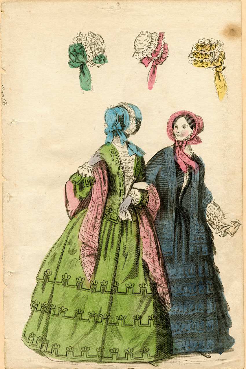 Two women are depicted standing arm in arm. Above their heads are three white bonnets. All three have ruffles and colored ribbons, one green, one pink, and one yellow. The woman standing on the left faces away and is wearing a blue bonnet with matching ribbon and white plumes. Her dress is green with a crenelated pattern on the hems of the sleeves, the bottom of the jacket, and three rows on the skirt. Her white blouse has a plain collar and is long sleeved.