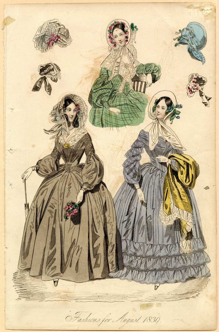 The woman has a yellow shawl edged with white lace ruffles over her arm. The upper half of a third woman is depicted above the other two. She wears a green, checked dress with full sleeves, long, tight cuffs, and a wide white lace shawl collar pinned with an oval gold brooch. Her white bonnet is trimmed with a garland of pink flowers and cascades of white lace.