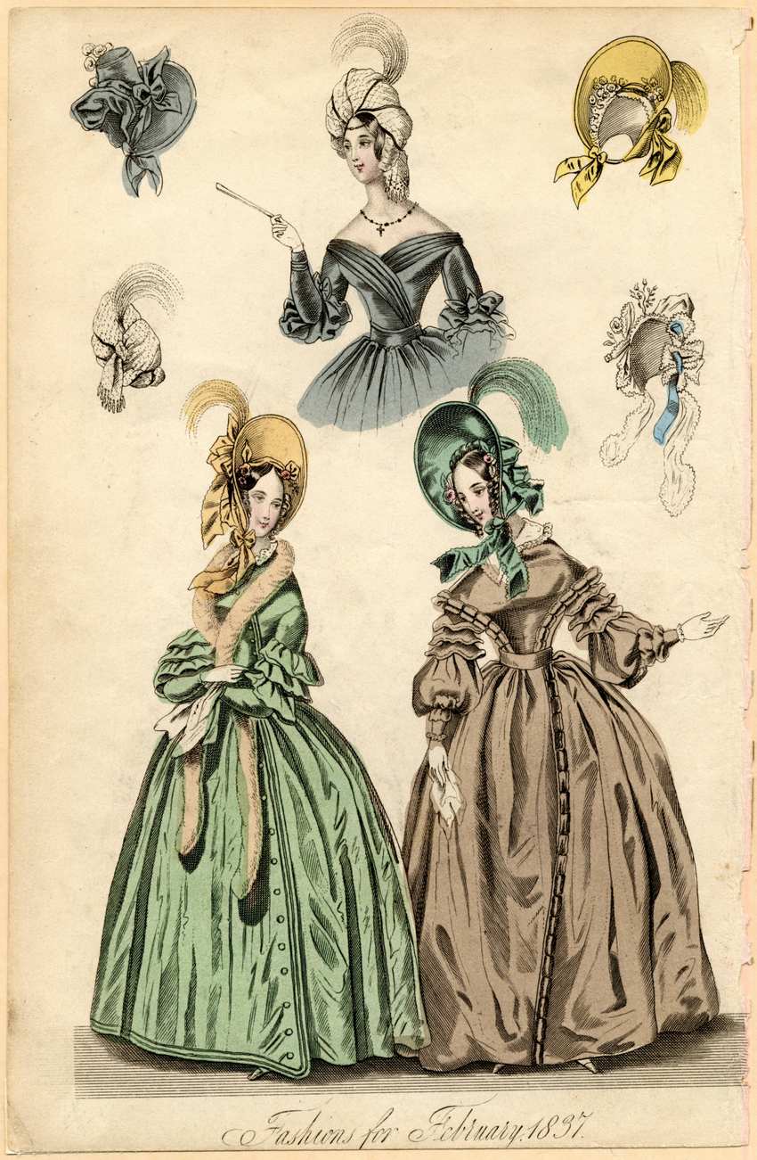 Her companion to the right wears a brown dress with full, bell-shaped skirts and a white collar edged in lace. A line of pleated decoration runs down the skirt, with two matching lines running over the bodice from the shoulders and ending at the waistline which is finished with a brown sash. The sleeves have three tiers of brown ruffles above the elbow, then bell out to the forearm. They are fitted below to the wrist; the cuffs are trimmed in white lace. The woman wears white gloves and shoes and carries a white handkerchief in her right hand. Her green bonnet is trimmed with bows and a large green plume at the crown.
