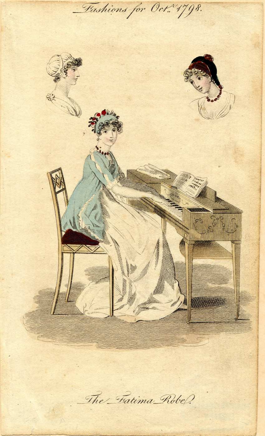 A woman and two busts are pictured in fashions for October 1799. The bust in the upper left corner wears a simple, white gathered bonnet, and a white fichu around her neck with a white daisy on the right shoulder. The woman in the middle plays the harpsichord. She wears a light blue band of cloth and a garland of red flowers in her hair and a red red bead necklace. Her overdress is light blue with elbow-length sleeves. The sleeves are buttoned at intervals down the side so that white from underneath shows through. The sleeves have a white ruffle at the cuffs.