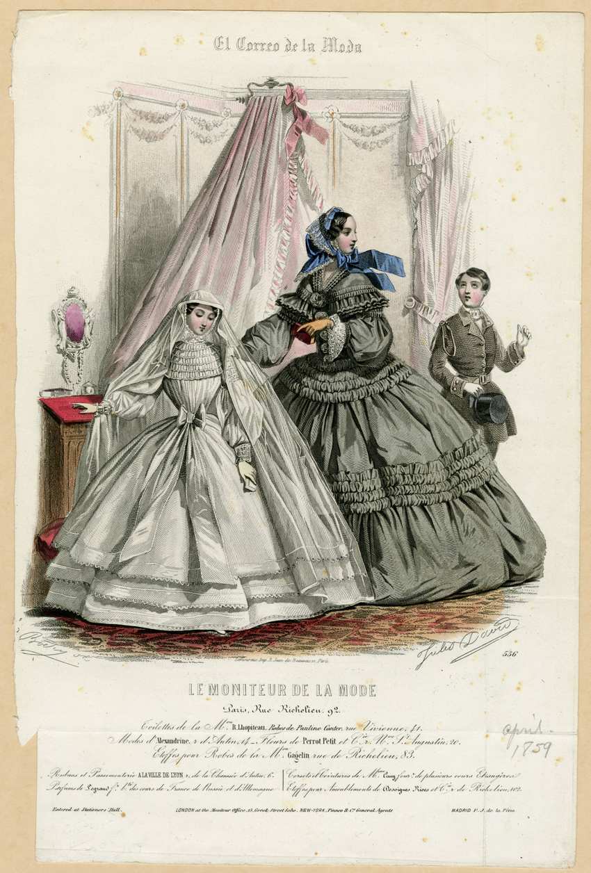 The sleeves of the dress are snugly cuffed and the bodice has five bands of ruched fabric at the yoke, over soft vertical gathers. She wears white gloves, a white square-edged hood, and a floor-sweeping white veil. Her mother wears a dark gray full skirted dress with bands of ruched fabric at the hip and knee, and a wide ruffle at the hem. The V-shaped neckline is created with three tiers of ruffles. Five rosettes are spaced down the center front of the bodice, and it has dropped shoulders. Three more tiers of ruffles trim the bodice below the neckline and across the upper sleeves.