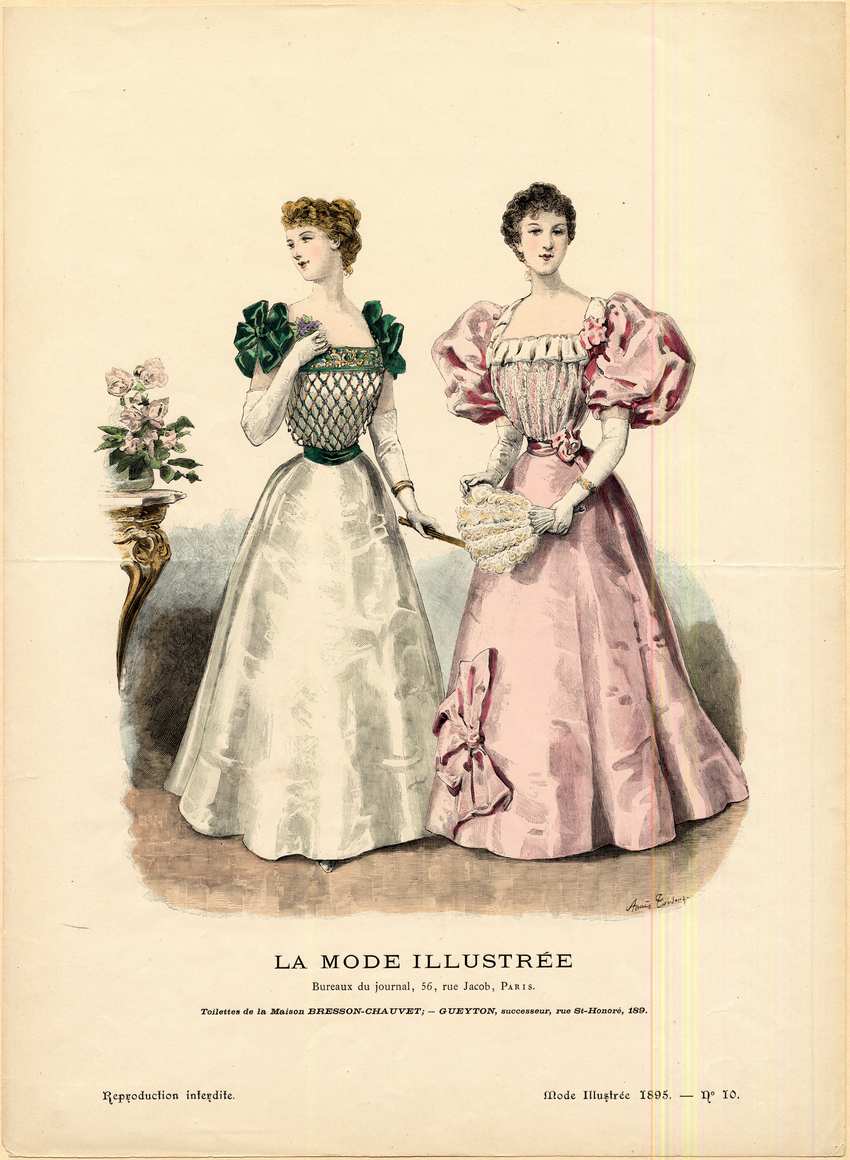 Two women are standing in ball gowns. The woman on the left is wearing a white satin gown with a very wide square neckline. Dark green bows form the short sleeves, and the bodice has a band of pink, green, and gold brocrade across the front, and green and pink netting overlays the white bodice. The waist of the dress is also dark green. She wears very long white gloves, has a small corsage of flowers, two gold bangle bracelets, and carries a closed fan.