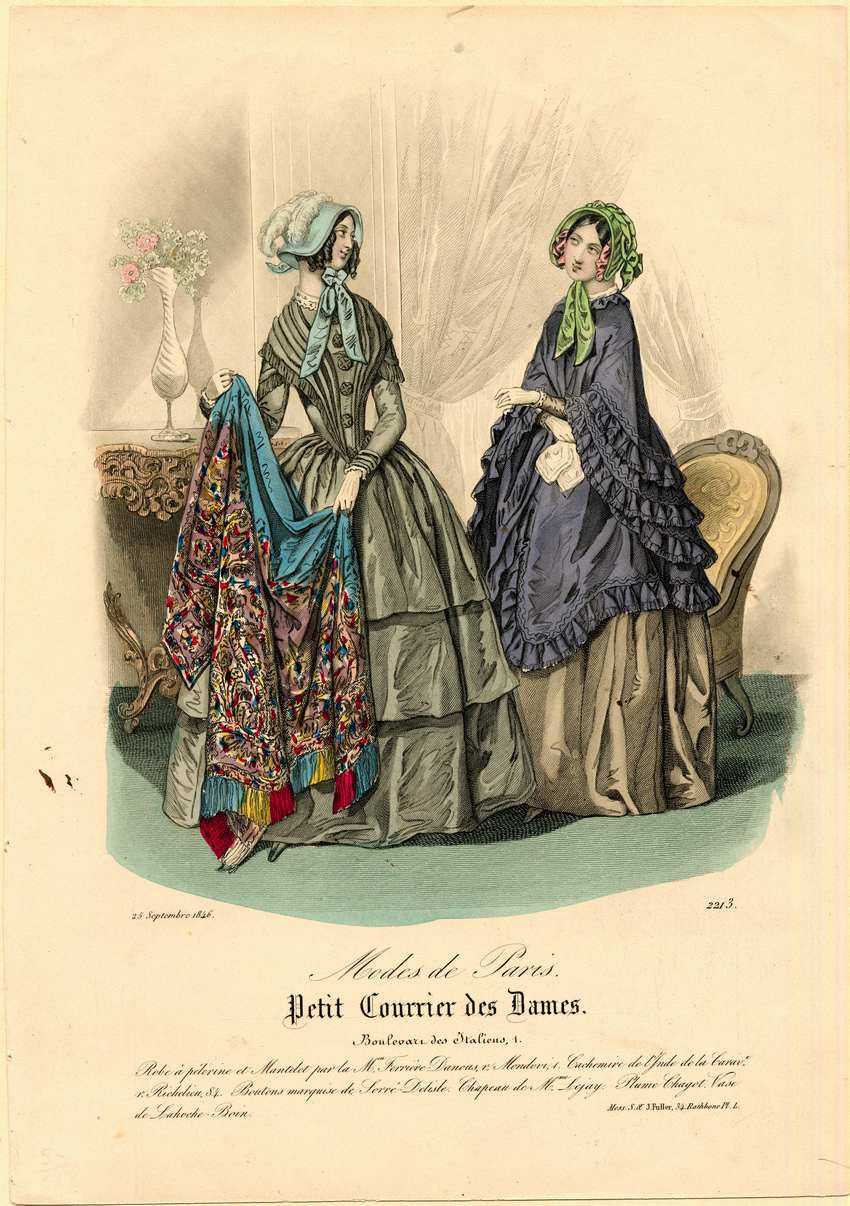 Two women are depicted in a parlor. The woman on the left wears a light blue bonnet with white feathers and a matching blue ribbon. Her dress is olive green with a plain collar, long sleeves, a three tiered skirt, and five large buttons down the front of the bodice. She holds a multicolored shawl that is blue, yellow, and red edged with fringe. The woman on the right wears a bonnet, dress, and mantelet while holding a handkerchief in her right hand. Her bonnet is green with green and pink ribbon. Her dress is brown and covered by a blue-violet mantelet with ruffled edges. The parlor contains a carved side table with a tall vase of pink flowers, drapes, and a gold upholstered arm chair.
