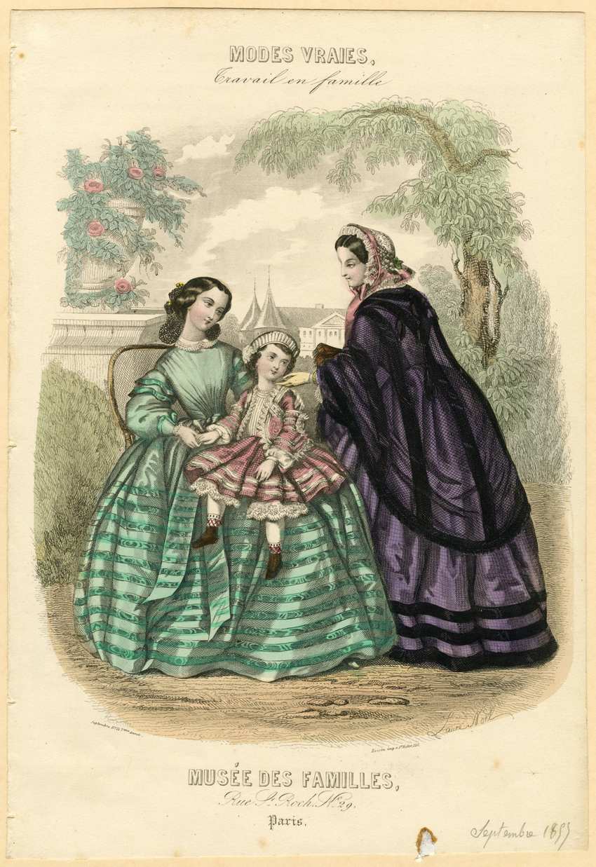 Illustrated by female artist Laure Noel (1827-1878), this print for the Catholic magazine “Musée des Familles” depicts two women and a child (or perhaps three generations) outdoors in a garden as they model their French fashions for 1857. The woman on the left is seated in a chair wearing a pale green dress trimmed with many horizontal rows medium green ribbon on the lower two-thirds of the skirt. The waist is tied with a long, wide sash, and the bodice is pleated and gathers at the center front of the waist. The jewel neckline has a narrow white lace edged collar.