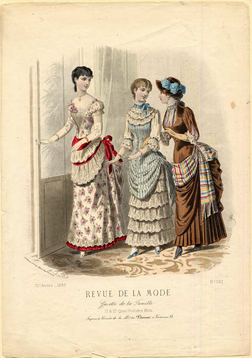 She wears white above the elbow gloves, gold bracelets on each arm, a pink and white choker necklace with a pendant, and pearl pendant earrings. She reaches for the door handle with her right hand, and looks back at her companions. The middle woman is wearing a high-collared blue striped dress that has three-quarter sleeves. The yoke is of three tiers of white ruffled lace, and two more tiers band the sleeves at the elbow. Both the neck and the sleeves have vivid turquoise blue ribbon, with a bow at the side of the neck. The striped bodice buttons down the center front to the hips, and the fabric is draped at the hips into gathers at each side above an underskirt of six tiers of gathered white lace.