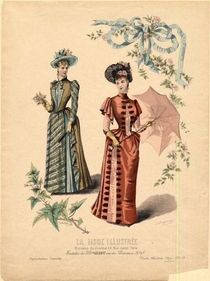 The collar of the dress rises higher at the back, and a blue ruffle is just visible inside the brown collar.The lapels of the bodice are narrow but deeply cut, with the upper lapel in two sections, and are of the blue floral pattern. The center of the bodice or the blouse beneath is pale blue, as are the narrow cuffs, and the side portions of the skirt. The back section of the overskirt is brown, and lined with the striped fabric, which is turned back in three descending sections at the sides. She is wearing tan gloves, and a pale blue hat decorated with pink flowers and blue ribbon. The woman on the right is wearing a salmon high-collared dress.