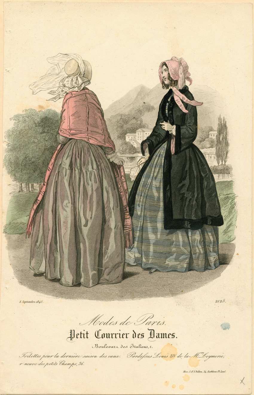 Two women are depicted in the countryside. There are mountains in the background, large white buildings next to a lake or river, and large trees, including a row of cypress. The woman at the left faces away and wears a white bonnet with a double ruffle at the back, and a sheer veil that blows in the breeze. She wears a light purple dress and a pink shawl. The dress has long sleeves with lace cuffs and the shawl has narrow black stripes and a deep fringe. The woman on the right wears a pink bonnet with ruching edging the brim and crown. Her blue and gray horizontaly striped dress has long sleeves. Over this she wears a black mantelet with black velvet or fur edging that is lined in pink. She carries a handkerchief.