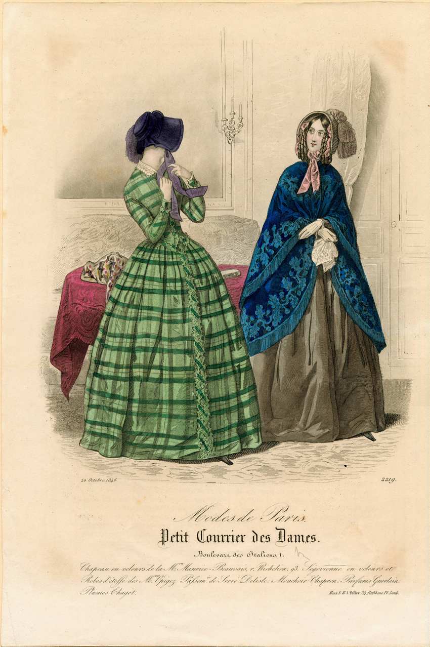 Two women are depicted in a parlor. The woman on the left faces away and wears a deep purple bonnet with a matching feather and ribbon. Her dress is green and darker green plaid. The bodice, peplum, and center front of the skirt are edged with bias-cut self fabric ruffles. The dress is long sleeved and has a narrow white lace collar at the high neck. The woman on the left wears white gloves and holds a handkerchief in her left hand. Her bonnet is light brown with matching feathers and pink ribbon. Her dress is brown with long sleeves and is mostly covered by a mantelet. The mantelet is deep blue edged with a lighter blue pattern of oak leaves and acorns and has light blue fringe. Behind the women is a mirror with a candle sconce, a sofa, and an oval table covered with a rose brocade cloth. On the table is a small book and a multicolored shawl placed there by the woman on the left.