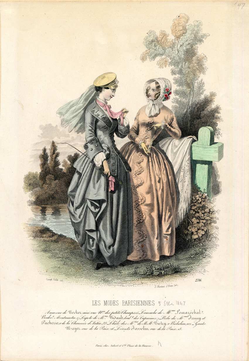 The woman on the right wears a white ruched bonnet decorated with red flowers on the side and tied under her chin with a white ribbon. Her dress is beige with ruffled trimmings around the shoulders and in a serpentine pattern down the center front of the dress. The long sleeves are cuffed with white lace and she has a pair of yellow gloves. The woman is resting her elbow on a green fence, on which her white shawl with fringe is draped. In the background are several trees with leaves that are just turning color for the colder fall weather. A small pond is visible in the background.