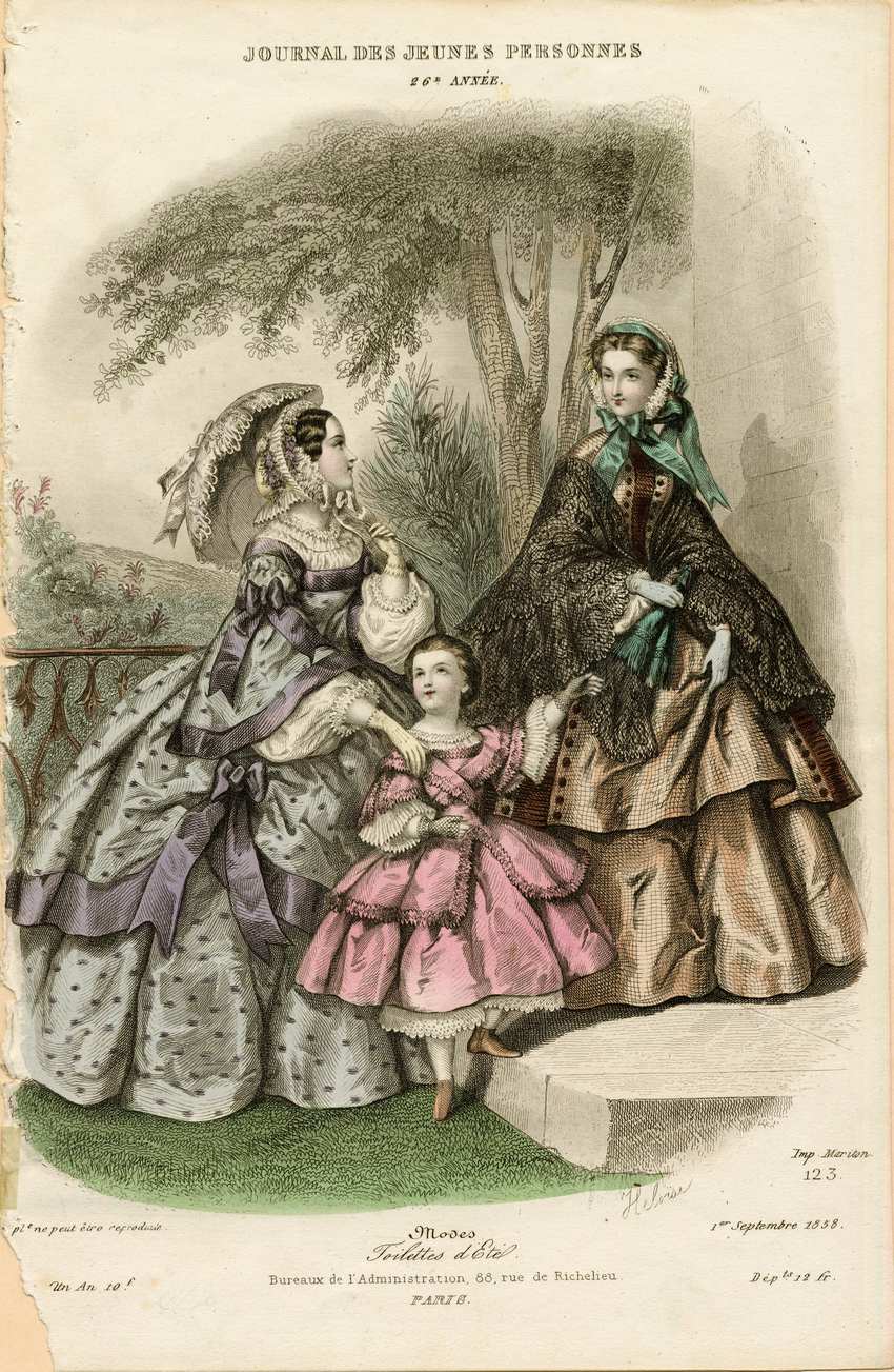 Two women and a little girl are standing outside. The woman on the left carries a parasol in her right hand. She wears a white bonnet with purple flowers. Her dress has a wide square neck and long bell sleeves. Outlining her sleeves, collar and top tier of her dress are wide purple ribbons with bows. Her dress is a light lavender with purple polka dots. She wears a white blouse with a gathered neck and long full sleeves gathered at the wrists. She wears white gloves. The little girl wears her hair dressed back off her face and a pink dress.