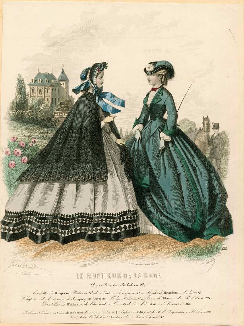 Two women are depicted outside. The woman on the left wears a blue bonnet with matching ribbon. Her dress is light gray with long sleeves and a graduated diamond and stripe pattern at the hem, and diamonds on the lower part of the sleeves. Over her dress, she wears a black cloak with lace edging. The woman on the right wears a riding habit. Her Breton hat is green with a white flower and green plume. Her jacket and skirt are dark green. The sleeves are long with wide cuffs. The jacket buttons down the front and has a peplum. The skirt has a row of buttons down the side of the skirt. The skirt and jacket are trimmed with a band of green satin on the hems, cuffs, and lapels. Under her jacket, she wears a white blouse with a plain collar and a red bow tie. She has green gloves and holds a riding crop in her left hand. Both skirts are very wide; it is the height of the crinoline fashion. Behind the women is a groom holding the rider’s horse, a white two story house with a tower, and gardens with trees and flowering shrubs.