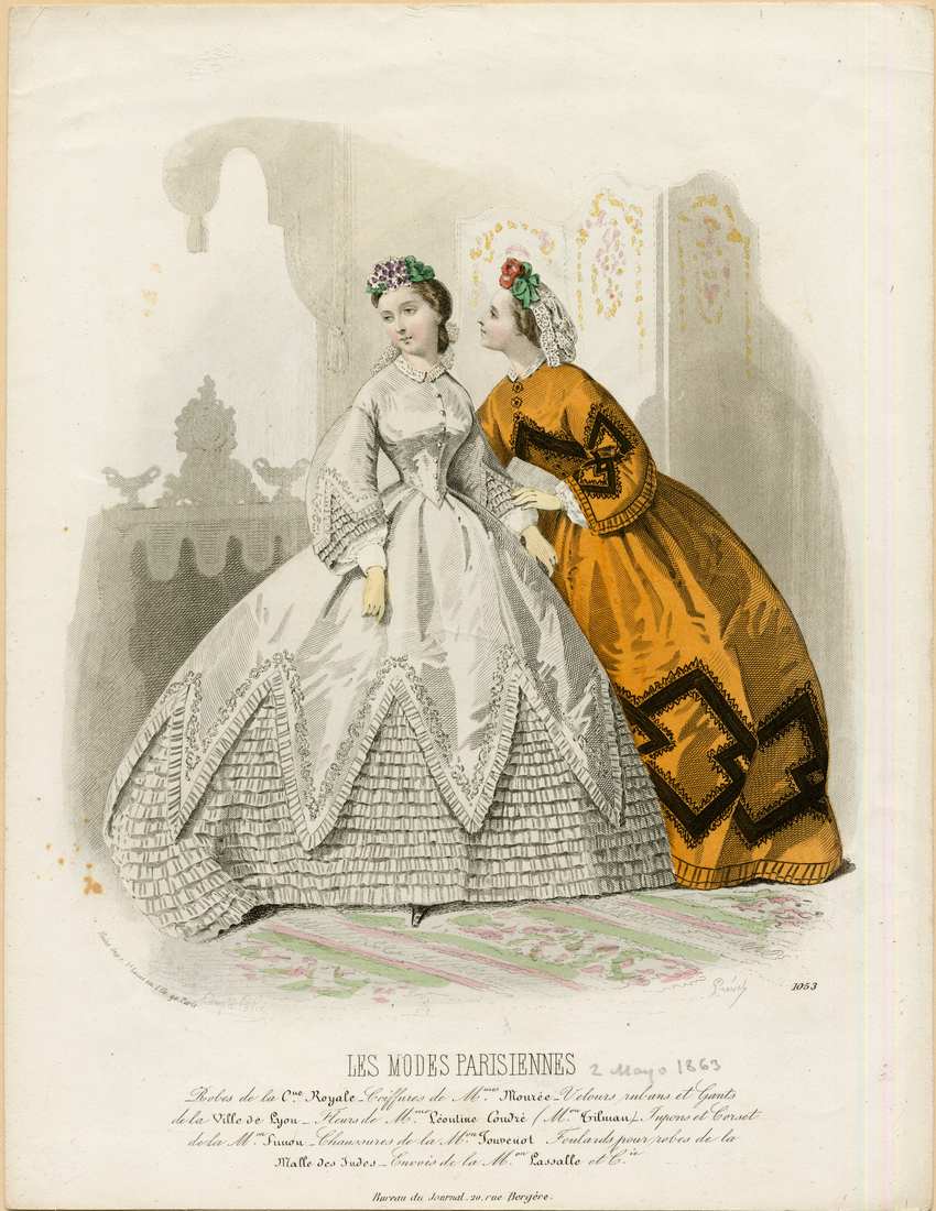 Two women are depicted in an Asian-inspired room. The woman on the left wears her hair adorned with purple flowers. Her white dress has a narrow ruffled collar and long bell sleeves. There are buttons down her bodice and her waist is pointed. There are ruffles at the ends of her sleeves and at the bottom of her skirt in a triangle pattern. The underskirt is visible below the triangles, and has multiple rows of narrow ruffles. The woman on the right wears a white lace cap decorated with red flowers. Her dress is orange yellow with a black interlaced diamond design on her bodice, sleeves and bottom of her skirt. Her dress has a narrow white collar and long sleeves, and buttons down the front of the bodice. Both skirts are very wide; it is the height of the crinoline fashion.