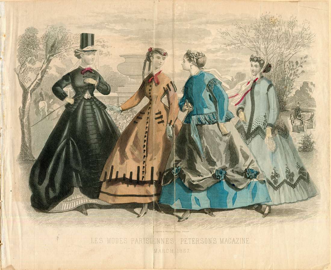 A small section of her white vest is visible at her waist, and her skirt is caught up at the right side, revealing a white underskirt edged with two narrow pleated flounces. The woman next at the right wears a low brimmed hat trimmed with red flowers and ribbons. Her princess-line dress is tan with a narrow white standing collar and long sleeves. She wears a red bow tie and has black buttons down the front of her dress. Her dress has graduated black vertical stripes at the hem of her skirt, at her shoulders, and end of her sleeves. She wears blue gloves, and pendant earrings.