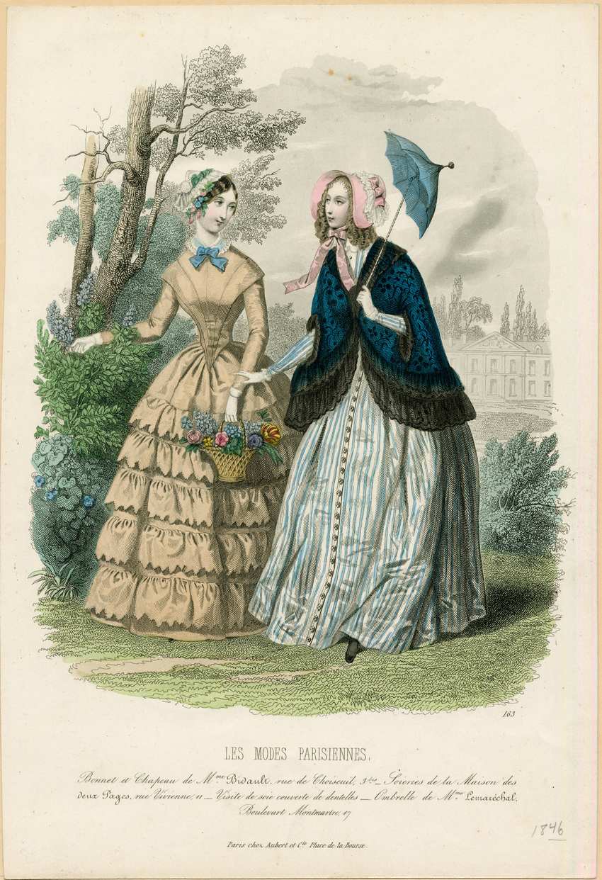 Two women stand in a garden. The one on the left wears a lace cap with ruffles, a gold dress, and carries a basket of flowers. Her cap is white lace with pink and blue flowers and green leaves. Her dress has a narrow white shirt collar and has a blue ribbon tied in a bow in front. The skirt has five ruffled layers. The bodice has a pointed waist and long narrow sleeves. The woman on the right wears a pink bonnet, a blue striped dress, a blue and black mantelet and carried a blue parasol. Her bonnet is pink with white lace and pink flowers. The white and blue vertical striped dress has a high collar, long sleeves, and buttons down the front to the hem. Her mantelet is a deep navy blue in black covered and edged in black lace.