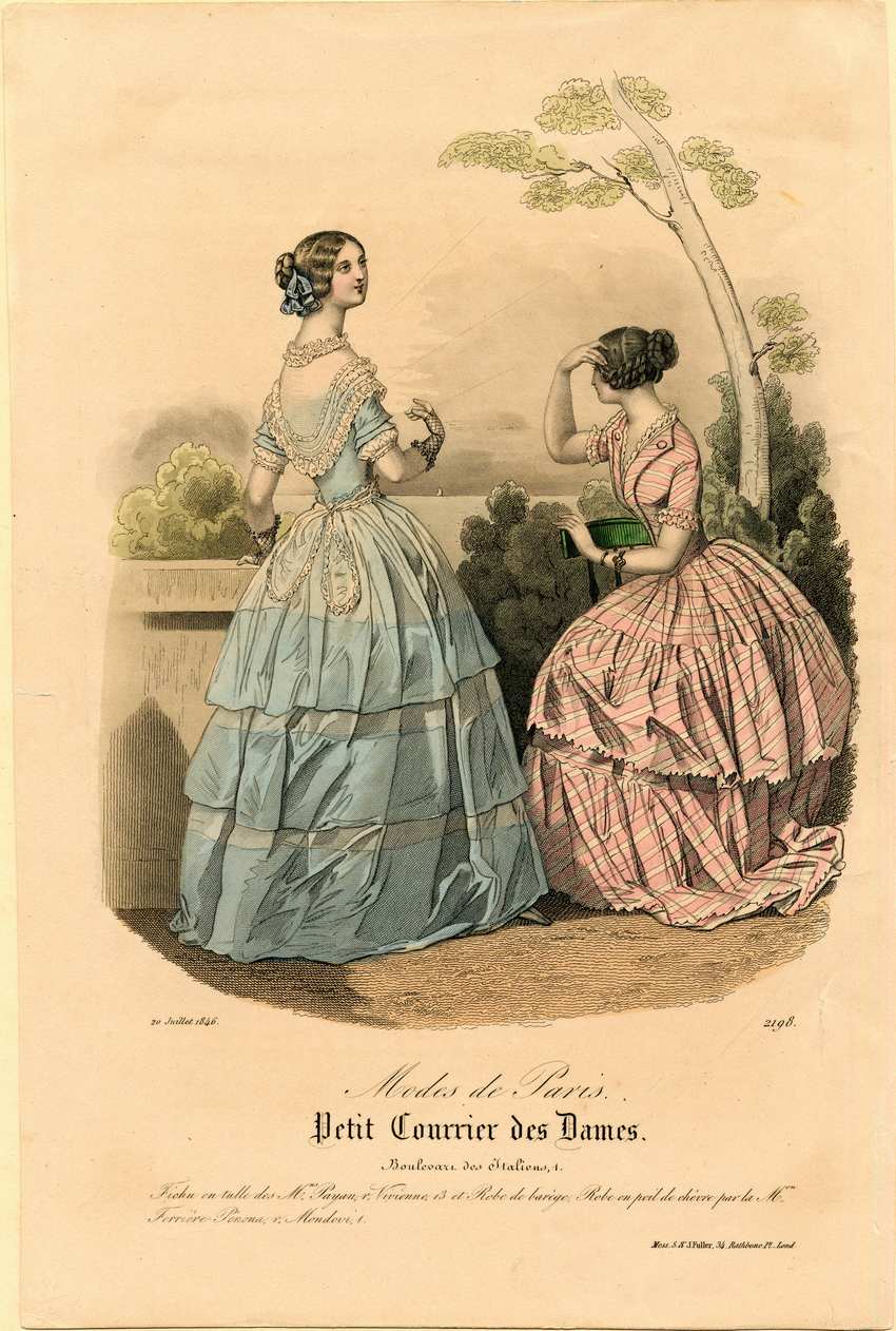 Two women are depicted on a terrace overlooking a lake. The woman on the left wears her hair in a simple bun with a blue ribbon. Her dress is a light blue with a three tiered skirt. She wears a lace edged tie around her waist, and a white transparent fichu with a rounded hem edged with rows of ruffles. The blue dress has an off the shoulder neck and short sleeves and she wears black lace mitts. The woman on the right wears her hair in a braided bun. Her dress is pink and white striped with a v-neck with lapesl with button details and short sleeves. Her skirt has two bias-cut ruffle edged tiers. She wears two gold bracelets on her left wrist and sits on a green chair.