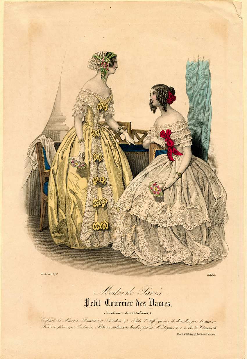 Two women are in a sitting room. The left is standing and wears a white lace cap decorated with pink flowers and green leaves. Her dress is yellow trimmed with white lace. The neck line is off the shoulder, and the dress has short sleeves of three tiers of white lace. The lace edges the bodice and the center front of the dress. Six wide yellow double bows decorate the center front. She wears white gloves and a wide gold bracelet on each wrist, and holds a bouquet of yellow and pink flowers in her right hand. The woman on the right is sitting and wears her hair up in a bun, with ringlets at the sides, decorated with a red satin pouf. Her dress is white lace and is off the shoulder with short sleeves of tiers of white lace. The skirt has two wide tiers of gathered lace. On her bodice she wears a large red bow, matching the pouf in her hair. She wears white gloves and one wide gold bracelet, and carries a pink and yellow flower bouquet.