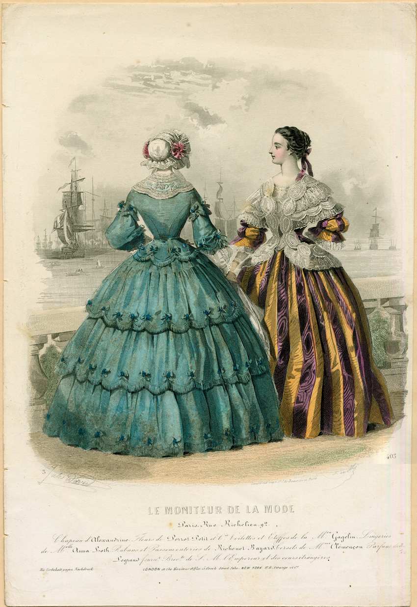 Two women are depicted standing at a balustrade overlooking a harbor with many large ships. The woman on the right stands facing away. She wears a white bonnet with a ruffle and pink flowers on either side. Her dress is vivid light blue with a wide white lace collar and elbow length sleeves. There are three tiers edged with fringed scallops on her skirt, with small darker blue bows at the top of each scallop. The woman standing on the right wears her hair swept back into a curled bun adorned with purple ribbon. Her dress has wide purple and gold vertical stripes with elbow length puffed and gathered sleeves, with lace ruffles underneath. The bodice is heavily trimmed with layers of white lace on the neck, sleeves, and the hem of the peplum.